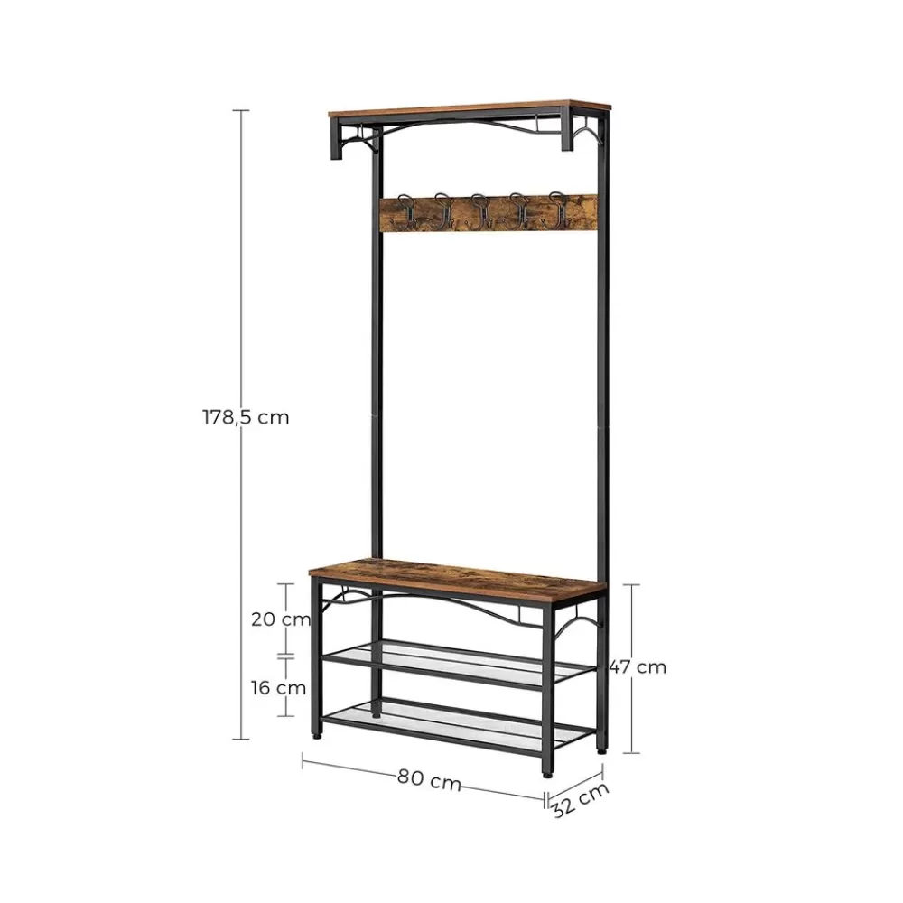 Schuhablagen – Die Metallablagen im unteren Bereich halten Ihre Alltagsschuhe an einem Platz, somit brauchen Sie nicht jeden Tag zeitaufwendig nach passenden Schuhen zu suchen.Holen Sie sich diesen ansprechenden Kleiderständer im rustikalen Stil zu Ihnen nach Hause und empfangen Sie Ihre Gäste in einem aufgeräumten Flur!