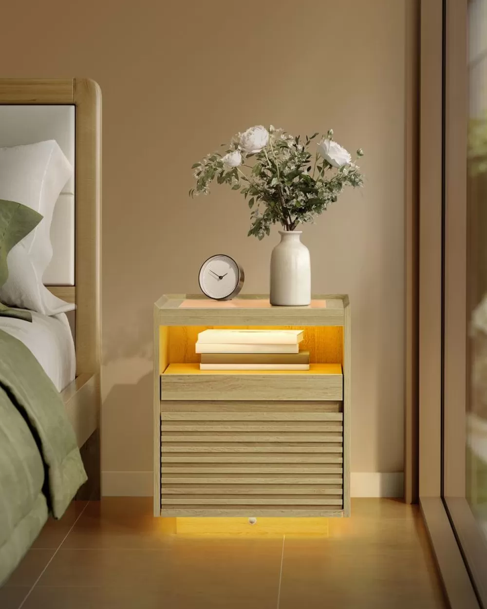 【EINLADENDES DESIGN】Mit dem Lamellen-Design, schwebendem Sockel und der natürlichen Farbe schafft der moderne Nacht…
