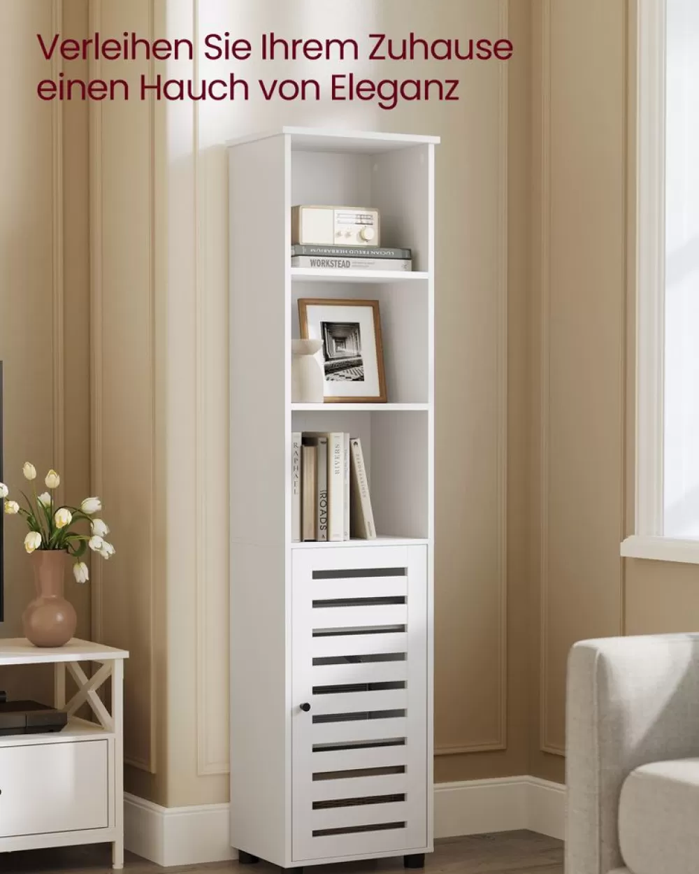 Genießen Sie den Effekt: Die vintagebraunen Holztöne dieses Hochschranks bieten eine ideale Bühne für Pflegeprodukte…