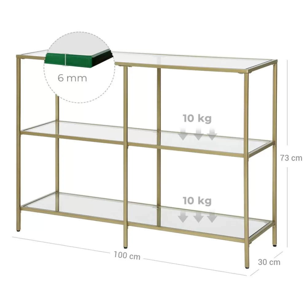 Glas ist modern, luxuriös und simpel. In Kombination mit einem goldenen Metallgestell erhalten Sie einen Konsolentisch, welcher stilvoll und praktisch zugleich ist. Platzieren Sie dieses schnittige Möbelstück in Ihrem Wohnzimmer, Flur oder in Ihrer Küche.Strapazierfähiges Glas