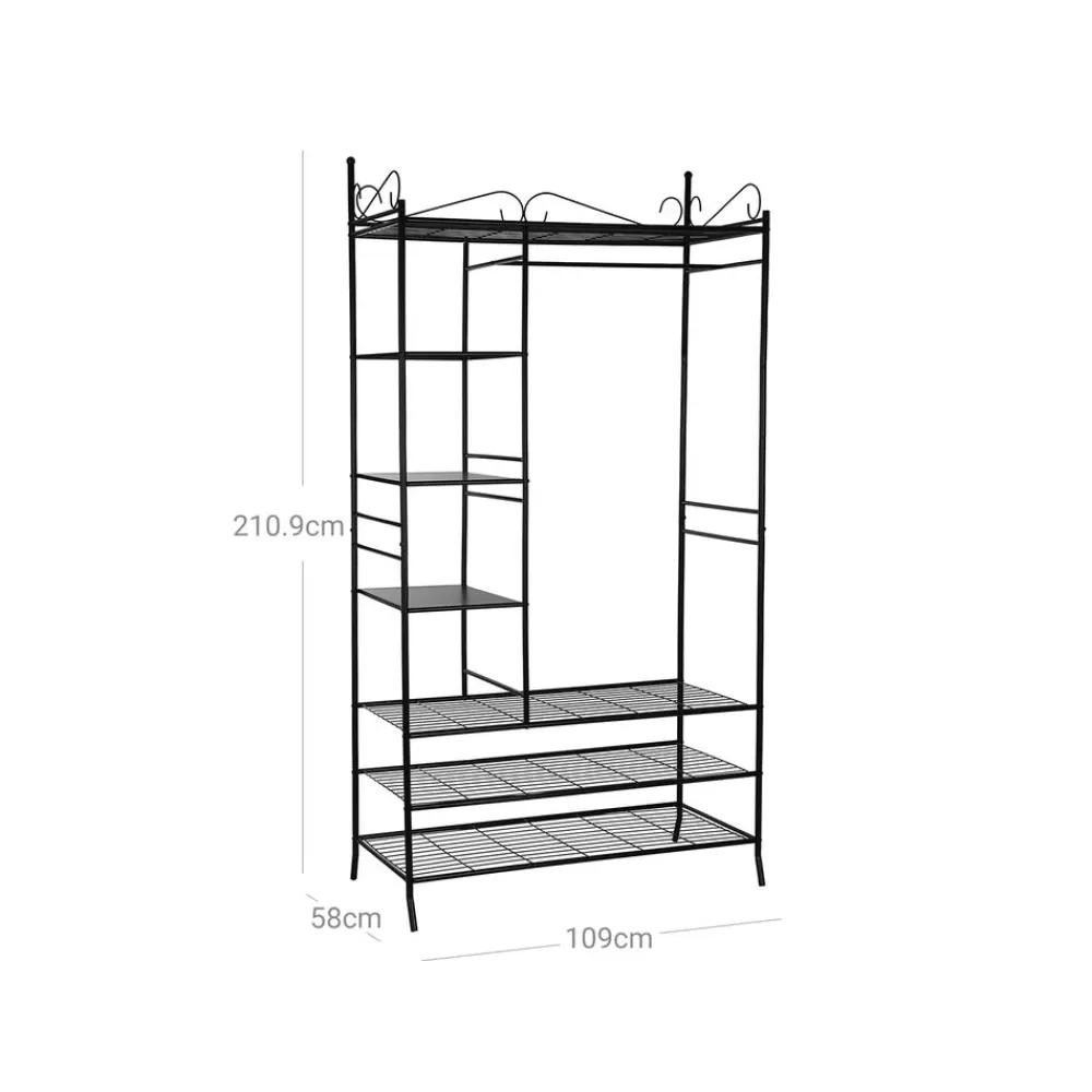 Das stabile Gestell besteht aus Metallrohren, deren Oberfläche mit geschmackvoller Einbrennlackierung bearbeitet wird, rostbeständig und pflegeleicht. Ausgestattet mit 1 Kleiderstange, 1 Netzablage unten und 3 seitlichen Ablagen verfügt der Kleiderständer über ausreichend Platz für Kleider, Blusen, Taschen, Hüte und vieles mehr. Alle Seiten sind mit Vorhängen überzogen, somit wird Ihre Kleidung vor Staub und Schmutz geschützt. Ob in der Garderobe, im Keller, Flur, Schlafzimmer, oder auf dem Dachboden sind Ihre Gegenstände darin ordentlich und leicht zugänglich verstaut. Einfach auf- und wieder abbaubar, in stabiler Ausführung.