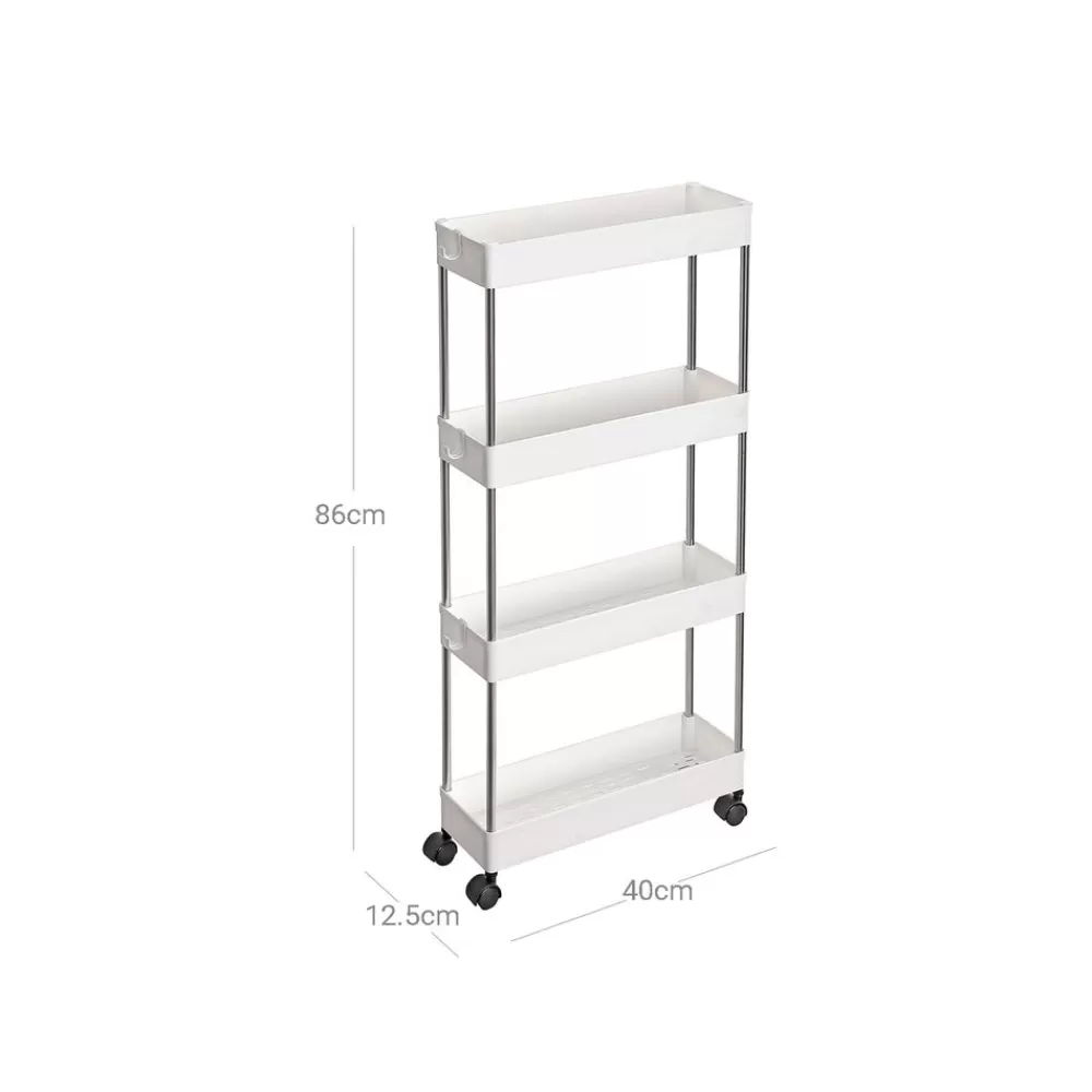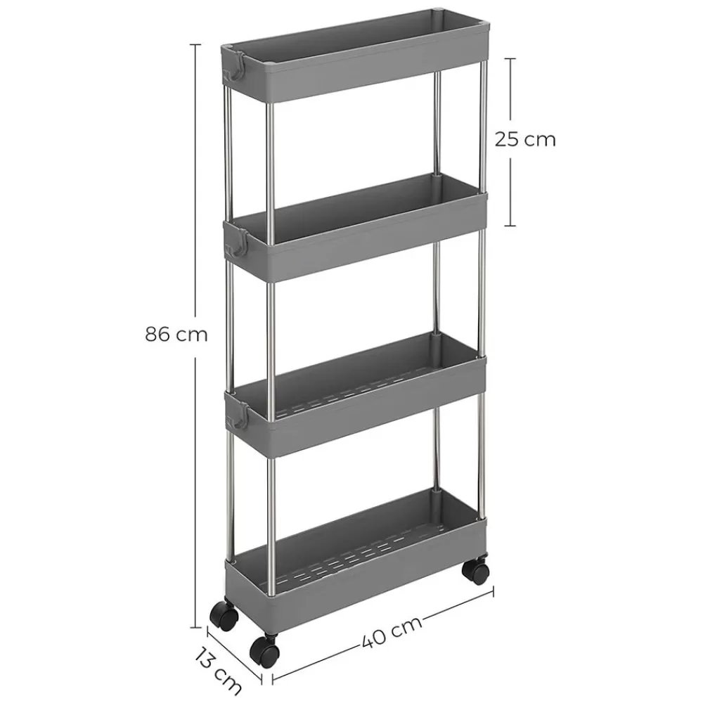 Alles in greifbarer Nähe: Mit 4 hochwertigen PP-Kunststoffablagen ausgestattet und durch robuste Eisenrohre gestützt, bietet dieser Rollwagen genügend Platz für all jene Gegenstände, welche noch keinen festen Platz in Ihrem Zuhause gefunden haben. Auch ihre Gewichte hält das Multitalent problemlos aus. Zudem passt der Servierwagen dank seiner kompakten Größe (40 x 13.5 x 86 cm) perfekt ins Bad, um dort Schönheitsprodukte aufzubewahren, in die Küche, um Küchenutensilien unterzubringen, oder ins Büro, um Dokumente zu verstauen.